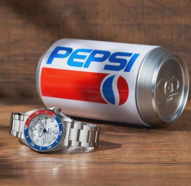 通常我们把蓝、红配色的GMT腕表统称为“百事圈”,来源于百事可乐的标志性配色,从劳力士格林尼治型开始,“百事圈”、“可乐圈”、“雪碧圈”层出不穷,虽然得不到官方的认证,但是这一昵称早已成为一个”标志”。今年精工和百事可乐联名,以精工的5 Sports系列经典设计叠加百事可乐的“logo元素”,推出全新全新5 Sports x Pepsi限量版腕表——一枚真正意义上的百事可乐表。
