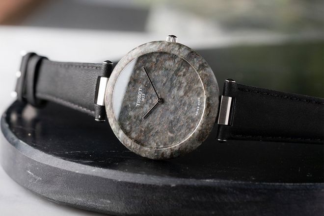 本次新推出的RockWatch限量999枚,原材料取自阿尔卑斯山的少女峰花岗岩,选取天然石料,自然也就能在表壳和表盘上看到天然的石纹理,我觉得这是矿物类盘面最迷人的地方,而天梭把这份迷人扩张到了整个手表。花岗岩的材料颜色和纹理,不仅带来一种特别的视觉效果,甚至还带了点时代沧桑的感觉,让人联想到漫长年代中地壳运动生成这些石头的过程,自然历史的厚重感就这么切割成一个圆盘摆在了你的手腕上,这感觉岂不是棒极了?