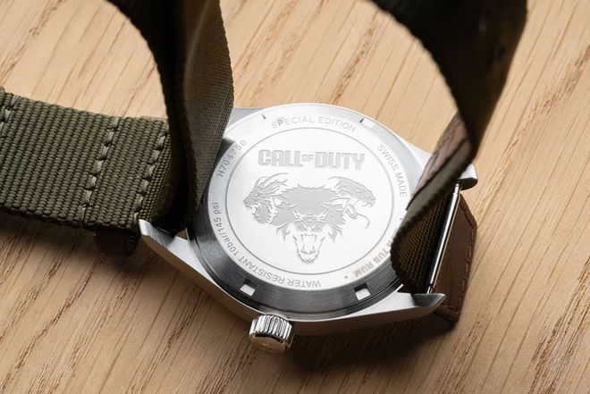 是的,你没看错,其实它用的就是量产款卡其野战小红帽的设计,除了尺寸之外,几乎一模一样,这并不影响它作为目前唯一在售的黑盘38mm日历窗卡其野战的独特性和稀缺性,并且这支限量款的底盖篆刻有《使命召唤:黑色行动7》主题,除了联名限量款以外是没有的。对于游戏粉丝而非腕表爱好者来说,这样的联名款式,能迅速消除玩家和手表之间的陌生感,甚至因为这种巧妙的虚拟-现实还原,能让游戏死忠粉非常乐意购买联名款手表(