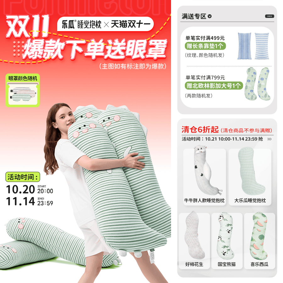 今年双十一,天猫乐瓜旗舰店将于 10 月 15 日 20:00 正式开启预售,多重福利让健康睡眠触手可及。活动期间,全店抱枕 8.5 折起优惠,直播间下单即加赠拖鞋;选购爆款 “萌萌恐龙”,还能额外获赠条纹眼罩。
