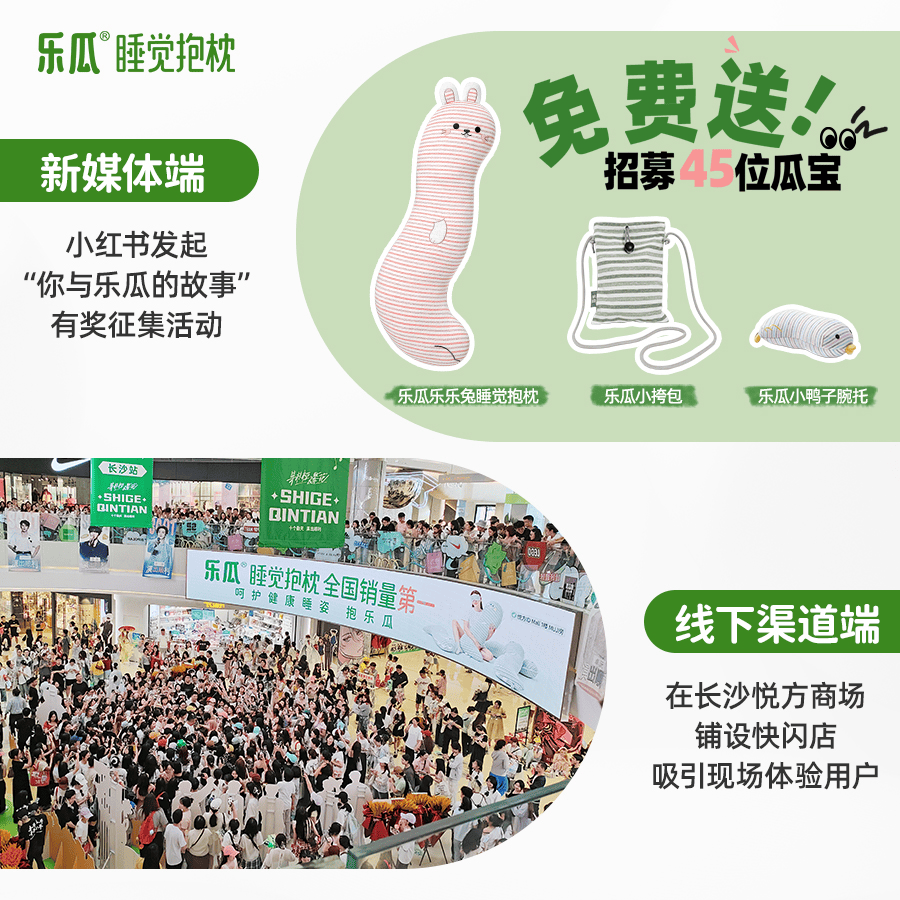 为让更多人了解科学护睡理念,FUNMELON乐瓜打造 “线上内容种草 + 线下场景体验” 的双引擎布局。新媒体端,品牌在小红书发起 “你与FUNMELON乐瓜的故事” 有奖征集,邀请老用户分享真实使用体验,让乐瓜睡觉抱枕(Sleeping Body Pillow)从功能层面的 “睡眠工具”,升级为情感层面的 “陪伴搭子”。